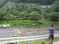 さらに下流に下り生コン工場のところに入るが連日人が入っていてココという場所で掛からない。見切りをつけてさらに下流のキャンプ場の赤橋上部まで下る。ここは先客がおり竿出しできずしばし見学、竿が曲がらないので期待薄かなと判断し再度上流に向う。