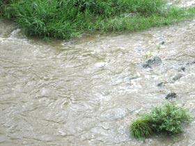 『濁流の玉島川、この状態で鮎釣りは無謀・・・』