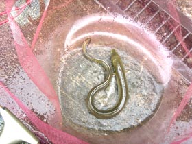 じわりじわり寄せると『ゲッうなぎやん』なんと、うなぎがヒット!!うなぎが掛かればお手の物、夜店のうなぎ釣で鍛えた腕。目つきが変わり003のほそいとでもタモ入れ一発。