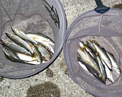 レッスンであごが疲れたよっさんも後半から釣り開始、「今日は入れ掛り間違いなし」と言っていただけあってわずか1時間半足らずで00匹の釣果、「さすがやね〜。」