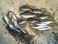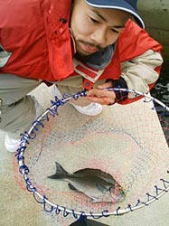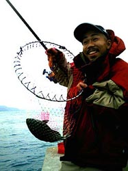 しばらくして最初に釣れたよりワンサイズ大きいイカが浮いてきた。慎重にタモ入れ成功、800gほどの良型イカで満足の坂口君、「たった数投で2杯のイカを釣り上げ成功!」