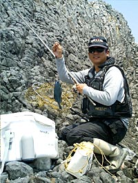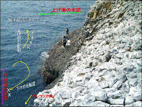 今回はゆっくり釣りたかったこともあり「小金城の水道に・・・」と思っていたら船長が「小関さん、ここ行きましょうか。」と船をつけてくれたのは大金城の「東の壁側」足場も悪く常に足を踏ん張っていないといけない所だが船長おすすめとの事で渡ることにした。 さらに船長が「小関さん、今日はデカイの頼みますよ。あと、数も!!」とハードルの高いノルマを言ってきた。 このポイントには自分を含め4人が降りたが船が離れる際、またしても船長が「このポイントは月曜日に7人上がってクーラー7杯釣れてます!!最大は41cmです。それ以上のサイズをがんばってくださいね〜」と、プレッシャーをかけて去っていった。 |