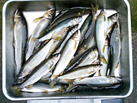 ![]() 総釣果 一番左側の大きい鮎が囮鮎、比較してもらえば今年のサイズがわかる。 |