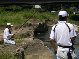 「ビラビラしている!!ビラビラ・・・」なんとも響きのいい話ですな〜 おいしい話は独り占め!!と思い??本当は一人での釣行予定だったが急遽前回講習会で初めて鮎釣りをしたKさんとUさんも行けるとの事で今回もご一緒。 そして当店スタッフのモーニング君、デカイのがあたっていることを聞いてみんなテンション高めでいざ厳木川へ「あんまり期待させんで〜」 |