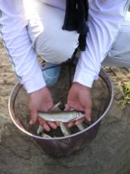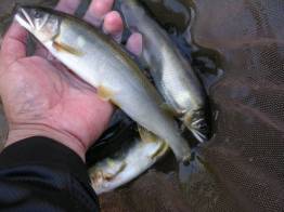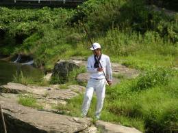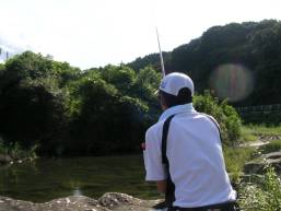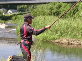 Uさんたちより下流に500m、1時間ほどかけて下流から釣りあがりましたが結局ノーヒットで元の場所に戻ってくるとすでにUさんが2匹釣り上げていました。 話を聞くと「ちかっぱふといバイ!!」「メッチャ引く!!」と興奮気味で更なる獲物を狙っていた。 |