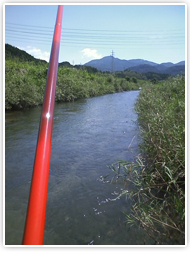 始めての場所も川の流れは色々で瀬、トロ、岩盤、チャラと色々あるけどどこもどの場所も川に入りにくい!!草ボーボー、岩ゴツゴツ。(だから鮎が豊富なんだろうね) そんな場所でも強引に入って釣り開始・・僕の好きそうな流れの緩い場所からオトリを泳がせるとすぐに反応あり!!幸先よし親指と小指を広げて釣れた鮎の大きさを測ると手より少し大きい23cm。 |