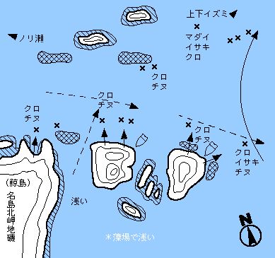 →ガイド← 北岬1番、2番 ガイド 沈み瀬が点在し、潮もよく通すため、非常に魚影は濃い。 クロは夏は25cm前後の数ねらい。冬はキロ級を含めて型ねらいとなる。2ヒロ前後のオーソドックスなフカセ仕掛けでよい。夜釣りのマダイは4〜12月まで。イサキは5〜10月頃まで釣れる。潮の流れが早いので大潮より、中、小潮ねらいがよい。