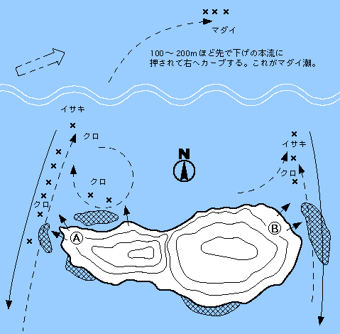 →ガイド← 低い独立礁でよほど条件がそろわないと上礁できない。特にマダイの大型が釣れるので周辺では一級の釣り場である。A点ではウキ下竿3本のカゴ仕掛けを足元から下げ潮に乗せ、沖の本流との合流点(100m先)で右流れに変わる。この時に当たる確率が高い。イサキも釣れる。クロは足元で十分でシーズンにはキロオーバーも釣れる。B点からはフカセのクロ、イサキがおもしろい。これも下げ潮をねらって足元から流す。