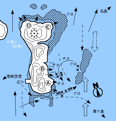 →ガイド← 沖磯の予備的釣り場だが、ことチヌに関しては超A級釣場である。年間を通してねらえる。A、B点が主な釣座で上げ潮がよい。A点では沖へ出てカーブするあたりを釣る。B点では本流への反転流をねらう。クロも大型こそ少ないがこの釣り方でよい。ウキ下は沖に沈み瀬があるため、チヌねらいでも2ヒロ半〜3ヒロぐらいでよい。夜釣りもフカセでよく、良型イサキとマダイがあたる。C、Dも予備ポイントだが、、D点ではサラシがあるとスズキがでる。